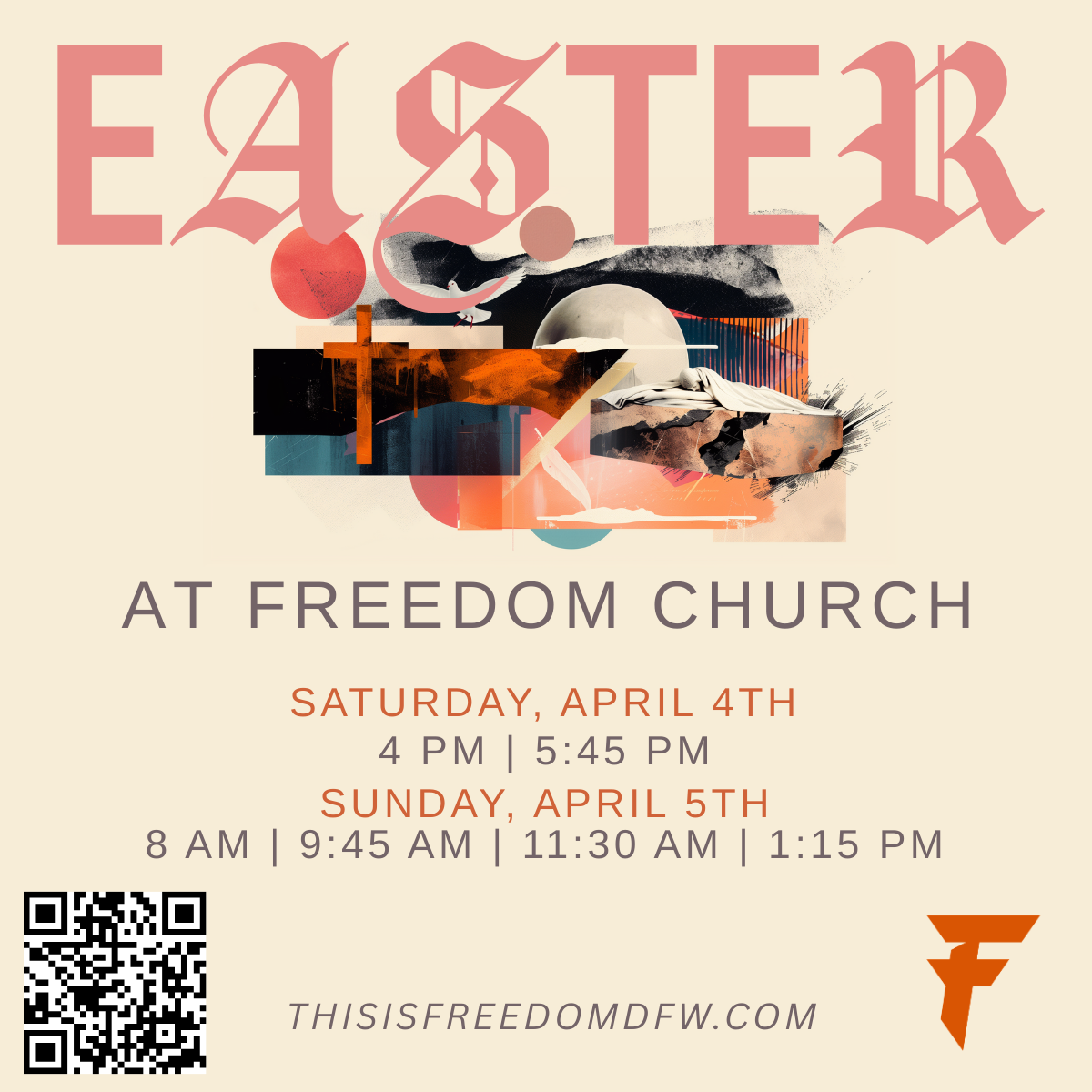 Hey! Do you guys have Easter plans yet? My church, Freedom Church in Bedford, is having experiences April 4th (4pm & 5:45pm) and April 5th (8am, 9:45am, 11:30am & 1:15pm). Lots of time options — I think you'd really enjoy it. Would love for you to come with me!